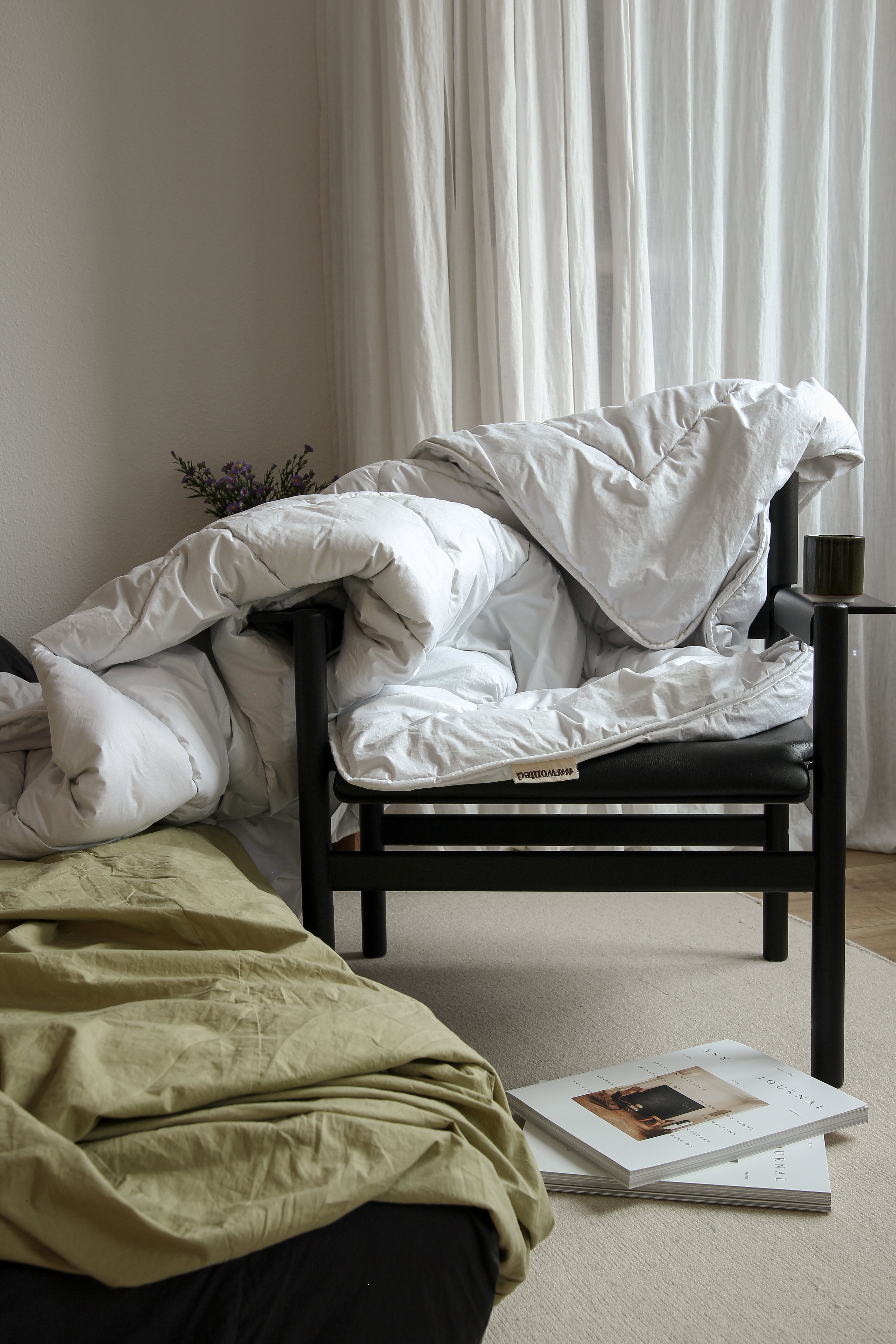The weight of the duvet settles.